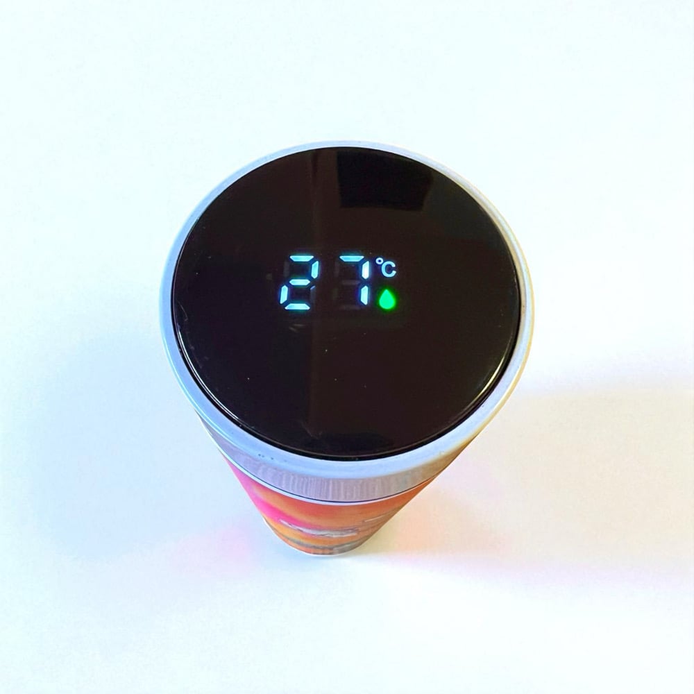 Stay hydrated with this double walled vacuum water bottle which bears my artwork of a green vase against a colourful background. Good for keeping hot drinks warm and cold drinks cool. The bottle top has a digital display that shows the temperature of the contents.