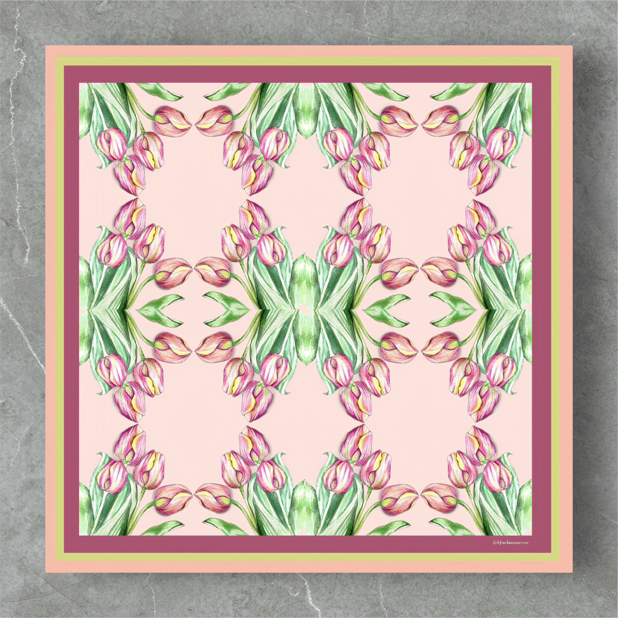 This satin scarf with my watercolour sketch of auspicious pink tulips will brighten any ensemble.